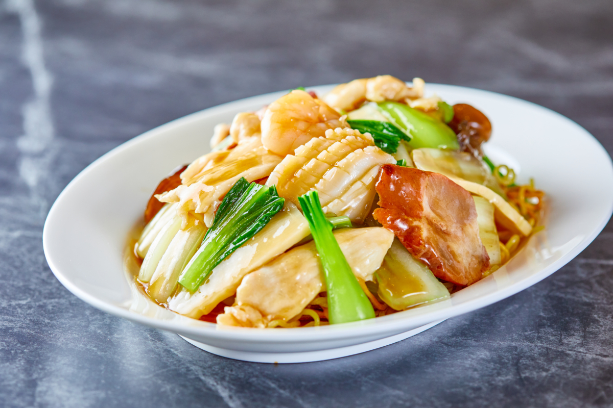 強火で一気に焼き上げた香ばしい麺の上に、大き目で食べ応えのある海鮮・肉・野菜を贅沢に盛り込んだ熱々の餡。