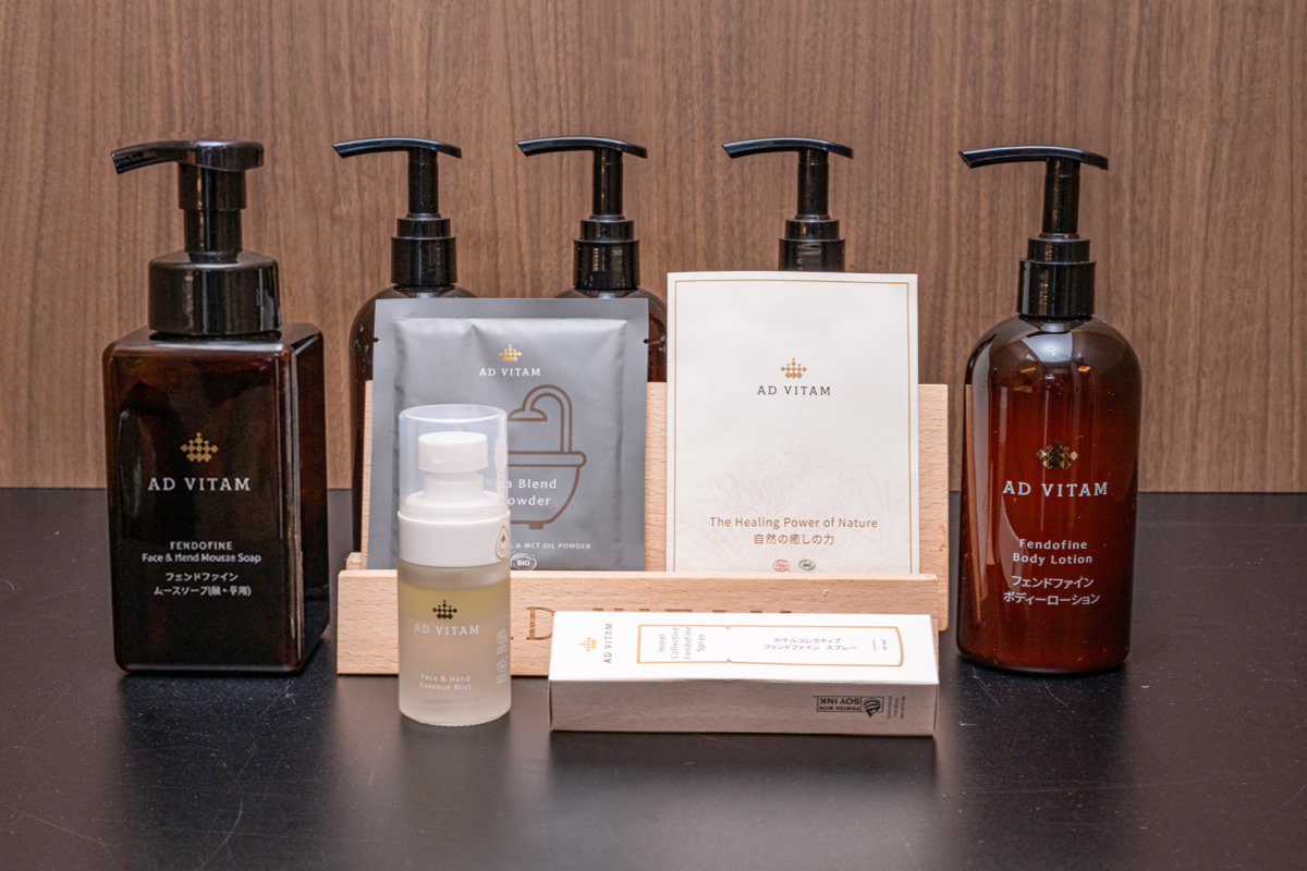 台湾発のオーガニック・トリートメントケア用品「AD VITAM アドヴィタム」の通常のバスアメニティの他ムースソープ、ボディーローション、バスパウダーとエッセンシャルミスト、フェンドファインスプレーをご用意しました。ここでしか体験できない極上のオーガニック体験をぜひお愉しみください。