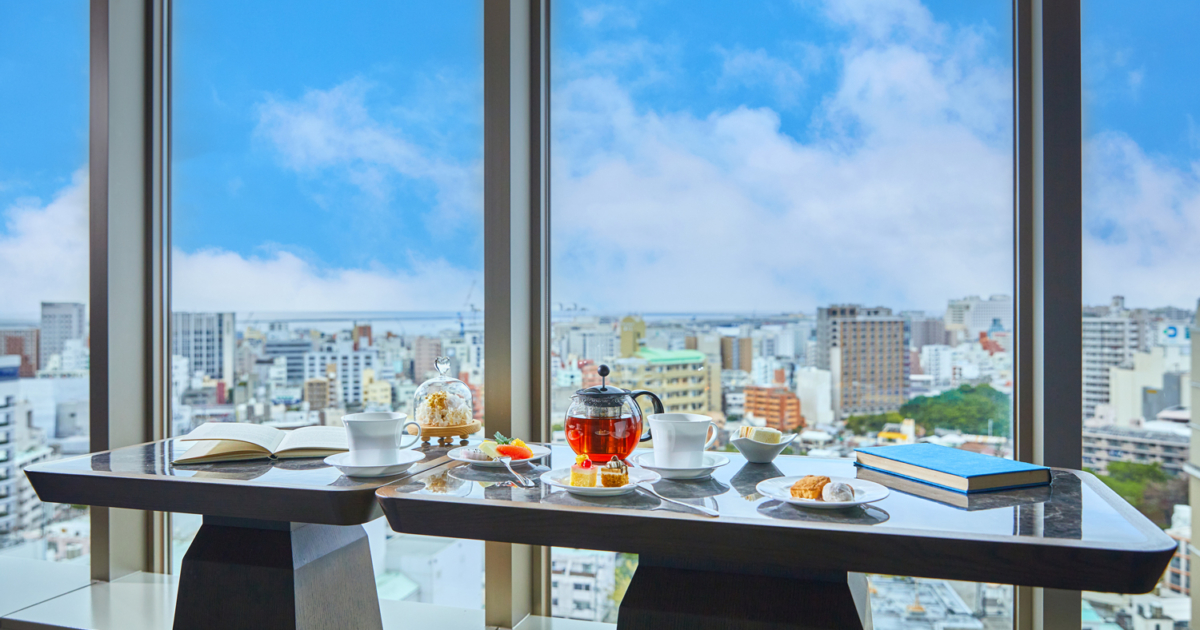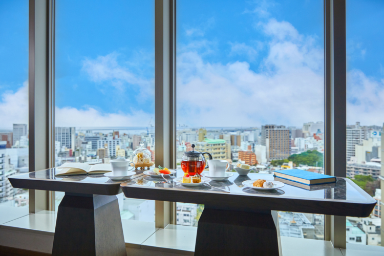 ホテル最上階のエグゼクティブラウンジはスイートルーム・プレミアムツインにご宿泊のお客様だけがご利用いただける贅沢な空間です。那覇市街の絶景を眺めながら、ティータイム・カクテルタイムなど、上質なひとときをお楽しみいただけます。