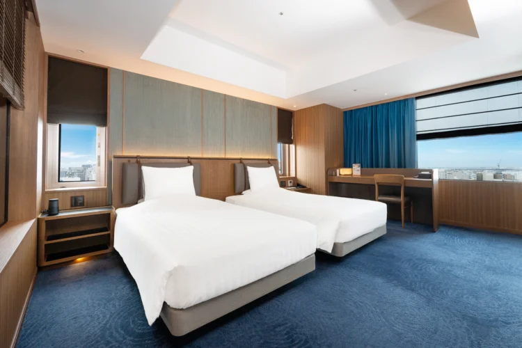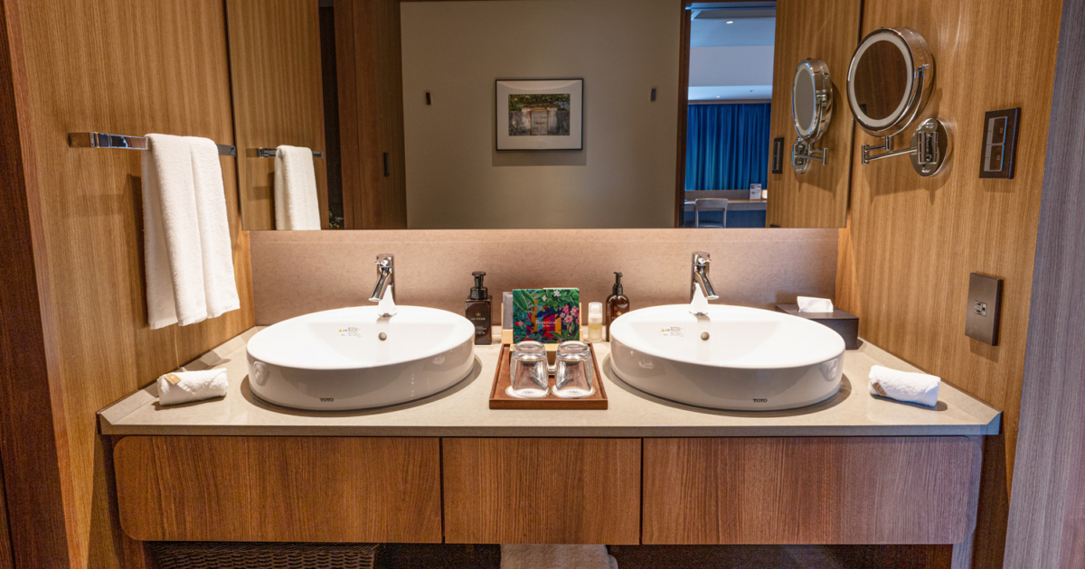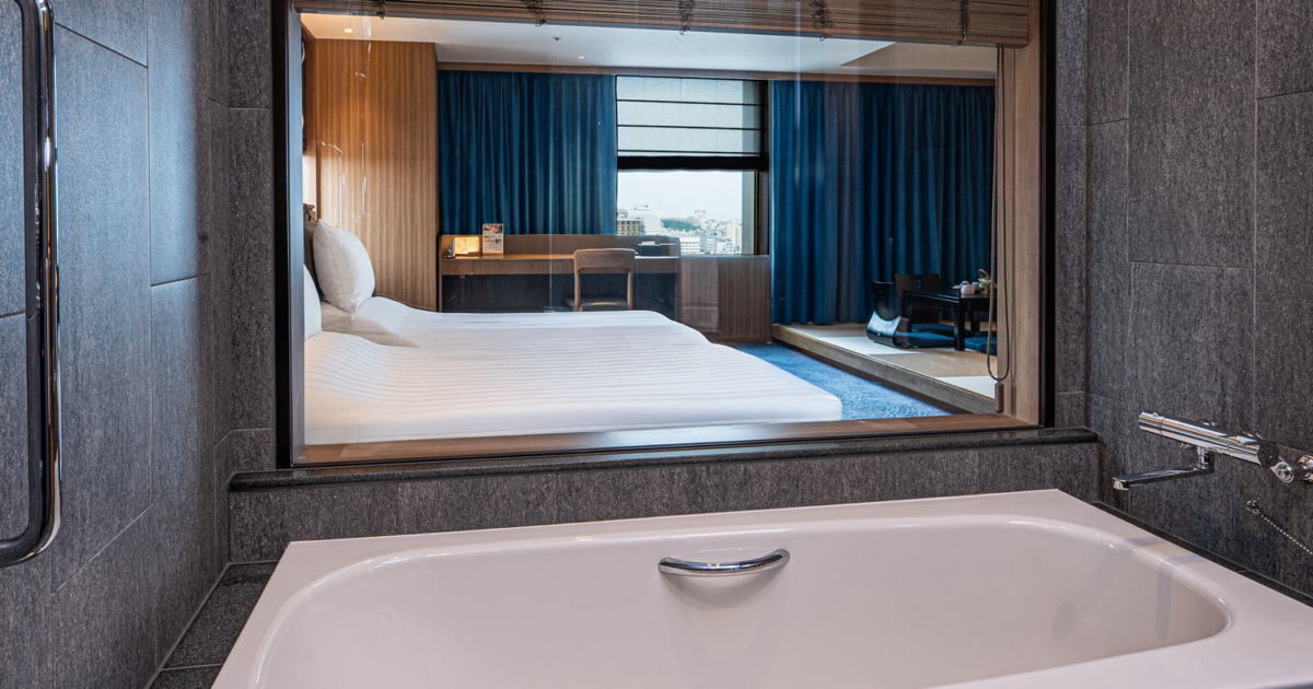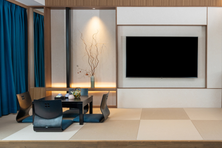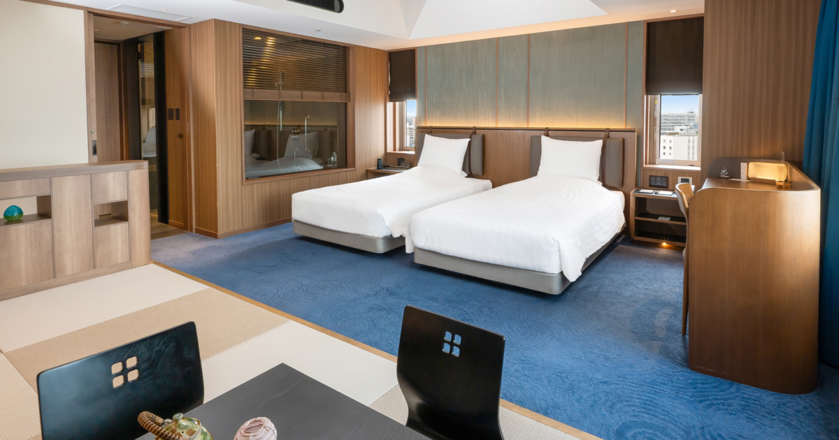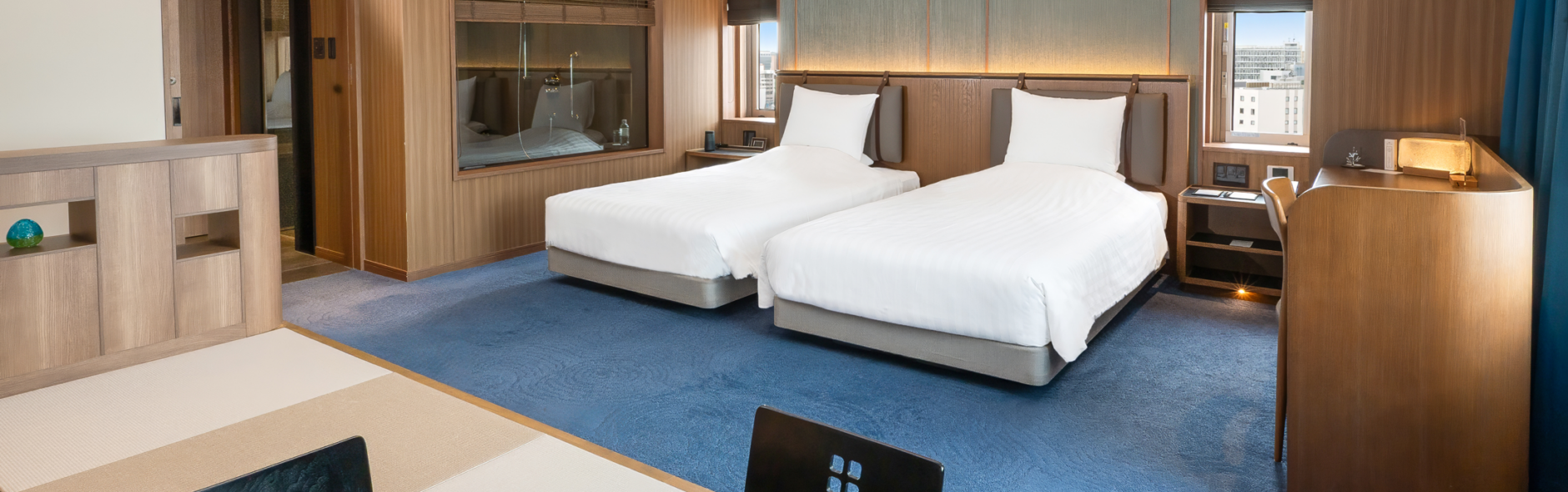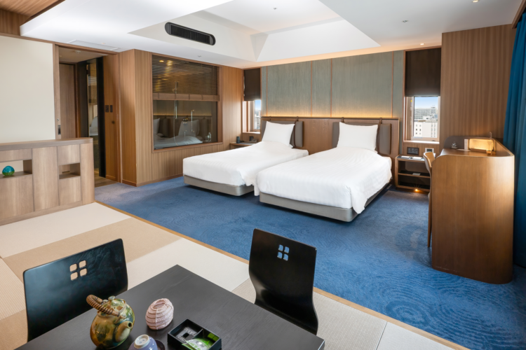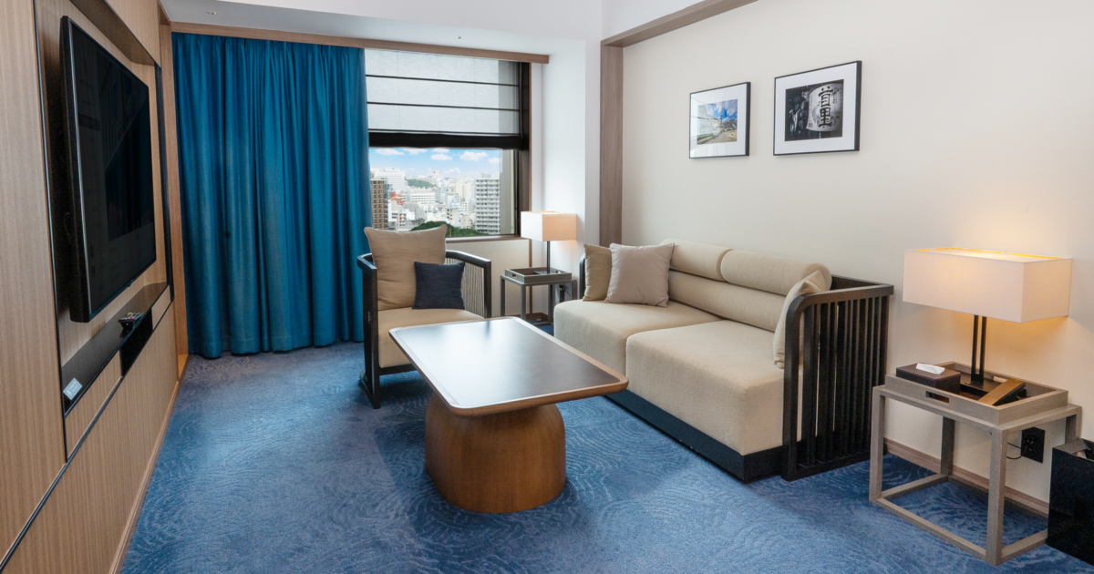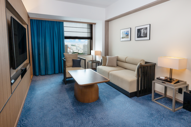 青を基調とした67㎡の客室は5-12階のお部屋全て角に位置し、65インチTVを備えたリビングと、琉球畳の和空間が調和するスイートで上質なひとときを。ご滞在中はエグゼクティブラウンジをご利用いただけます。