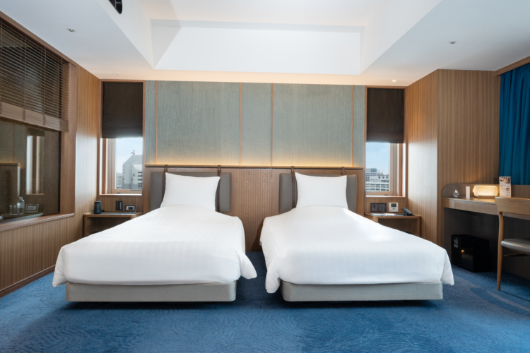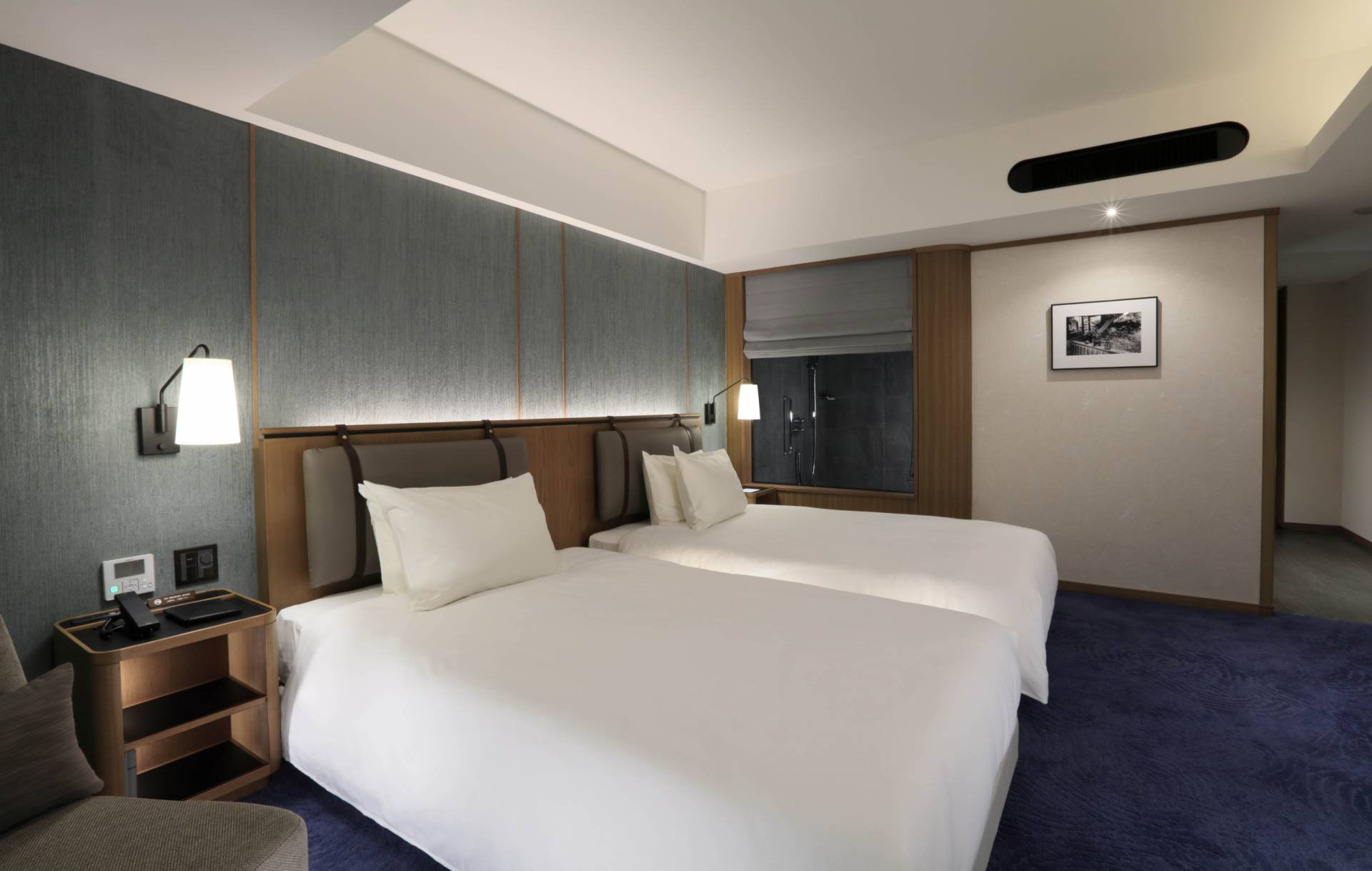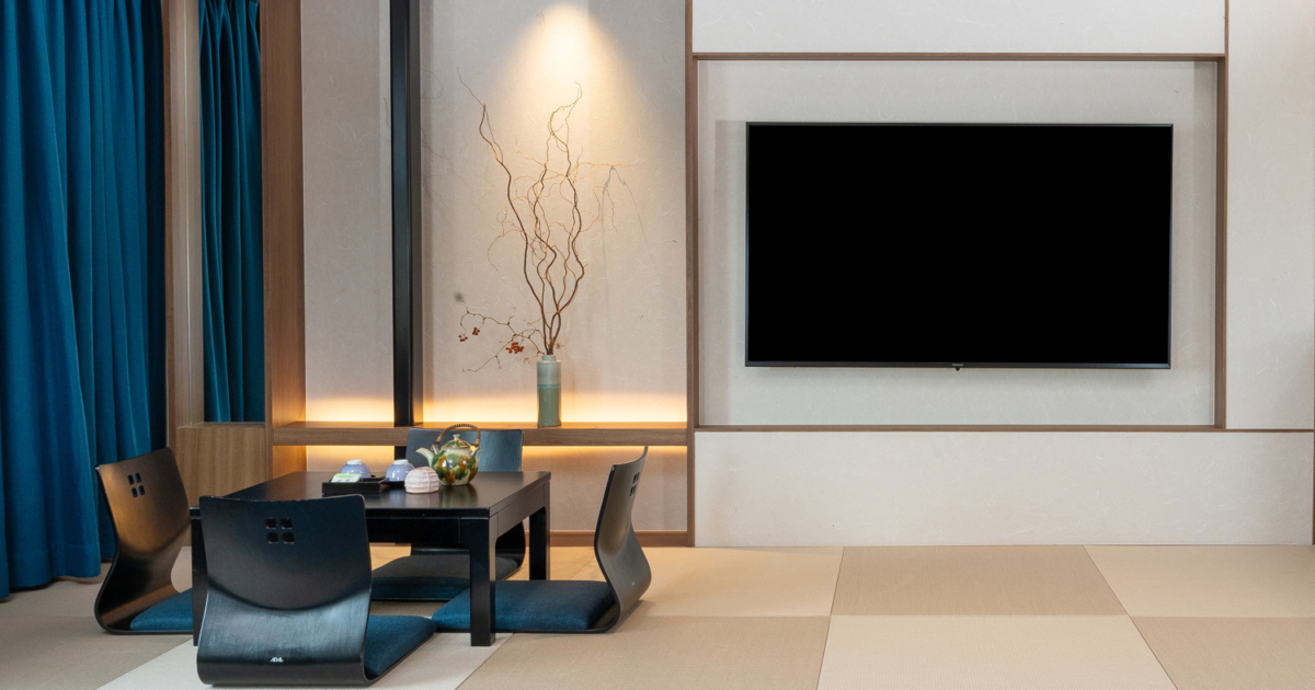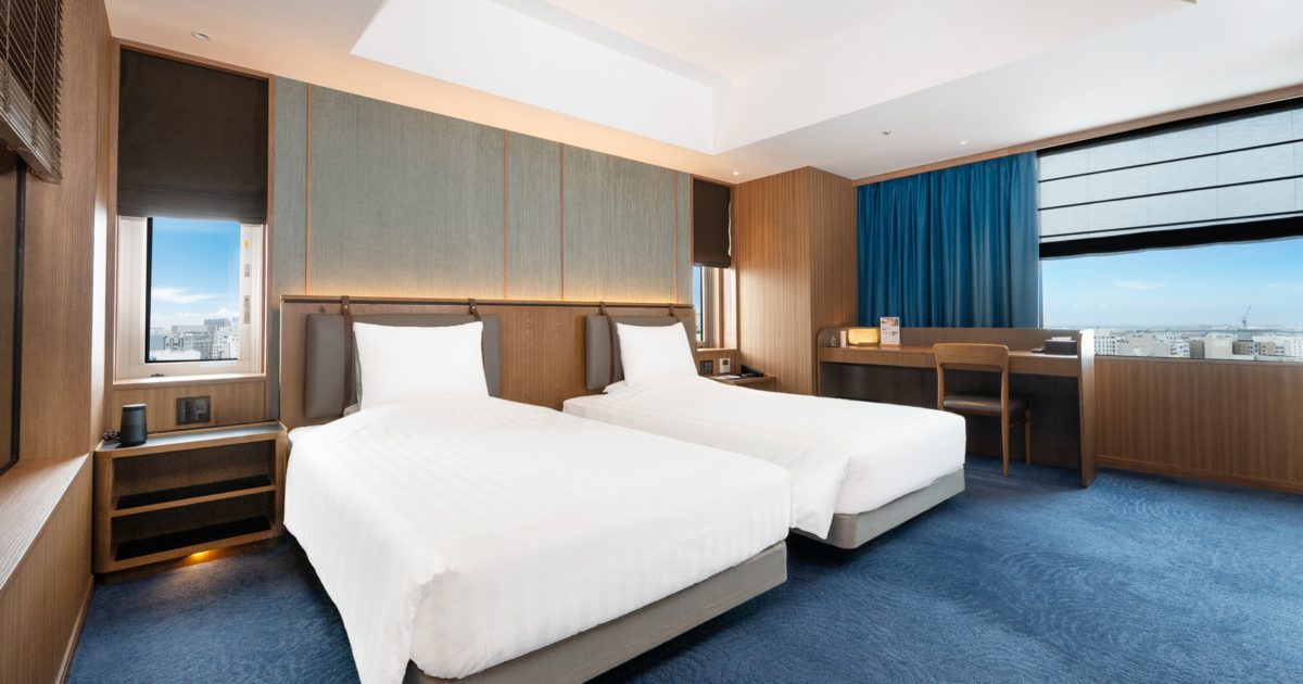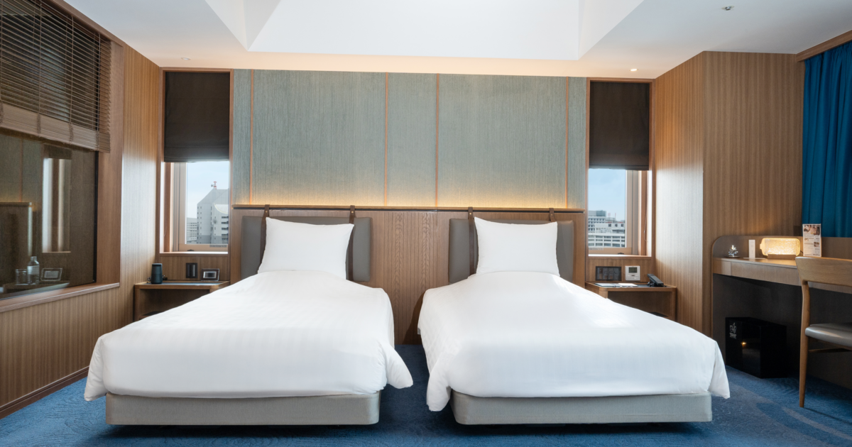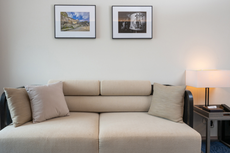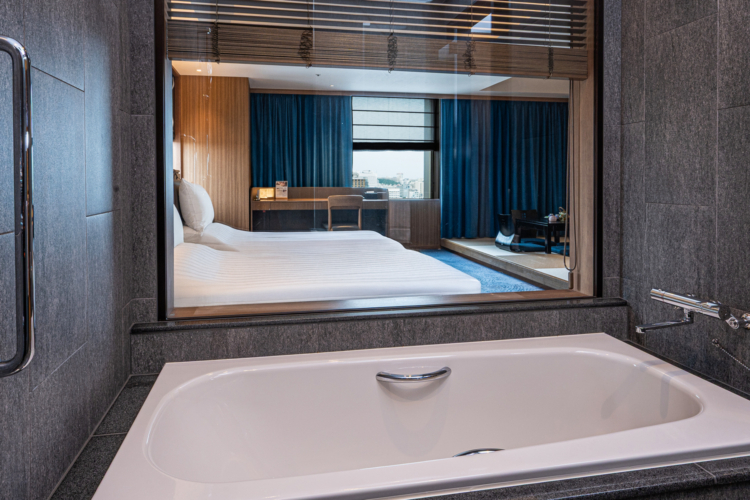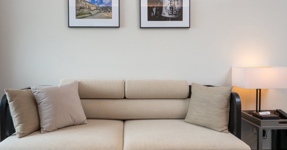 青を基調とした67㎡の客室は5-12階のお部屋全て角に位置し、65インチTVを備えたリビングと、琉球畳の和空間が調和するスイートで上質なひとときを。ご滞在中はエグゼクティブラウンジをご利用いただけます。