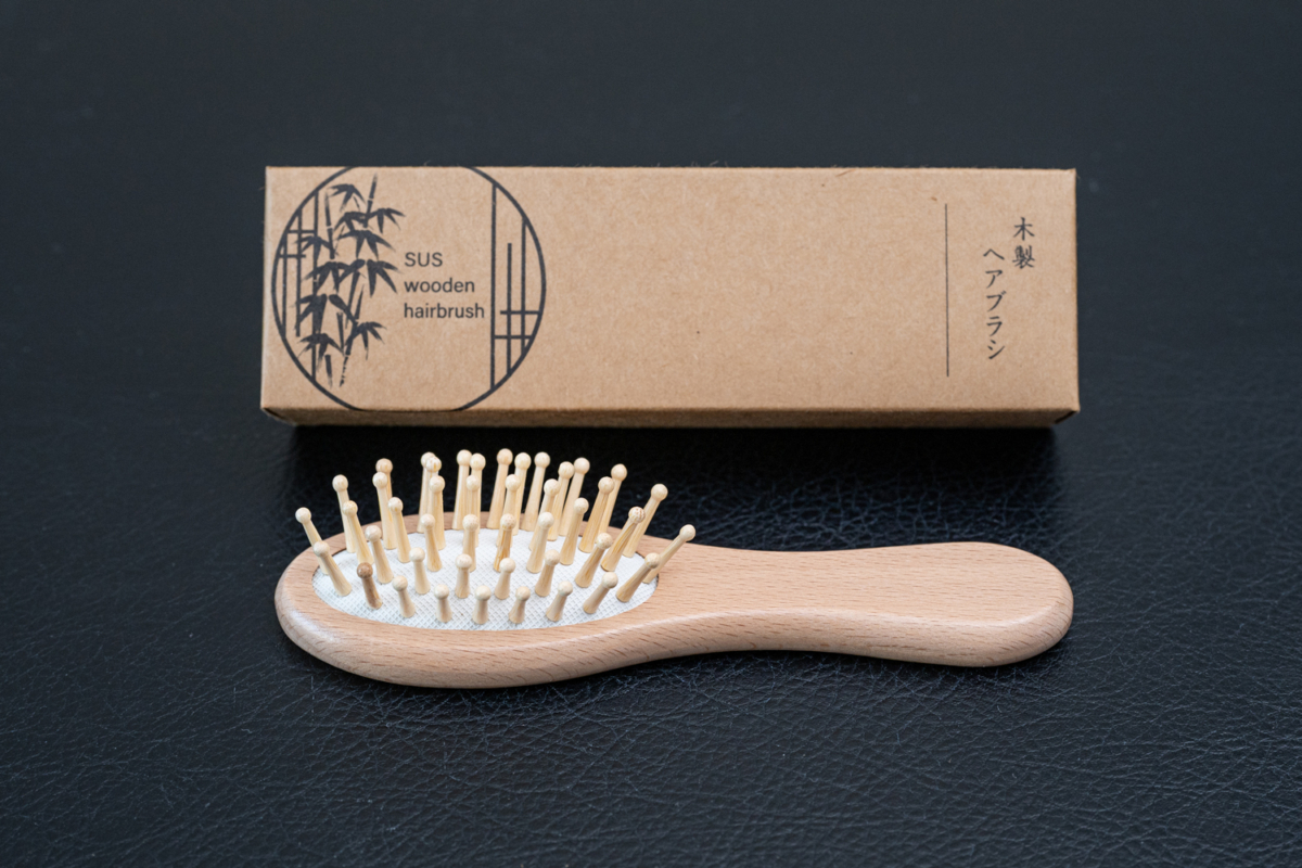 柄の部分に天然の間伐材を使用した木製のヘアブラシ。丈夫で長く使用できる機能性はもちろん、プラスチック使用量を削減できる、環境にやさしい製品。