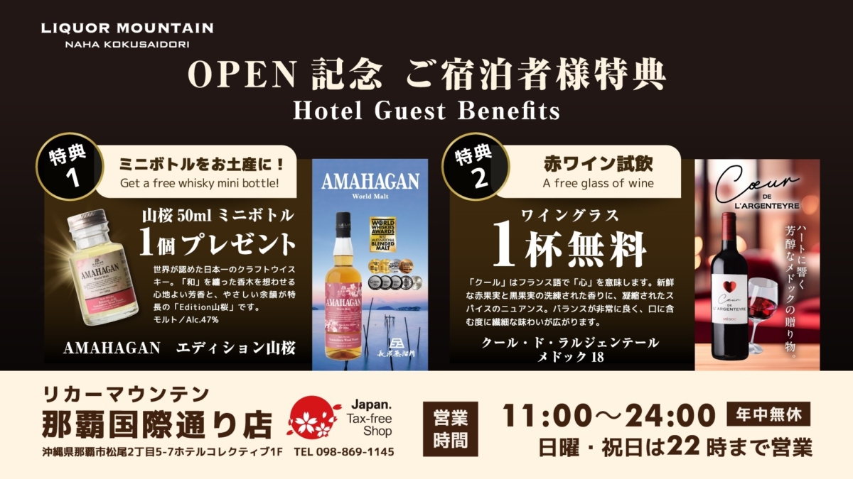 お正月振る舞い酒 場所 1Fロビーシャンデリア前時間 9:00〜11:00 ※さんぴん茶もご用意しております。 先着100名様にホテルオリジナルミント缶をプレゼント |