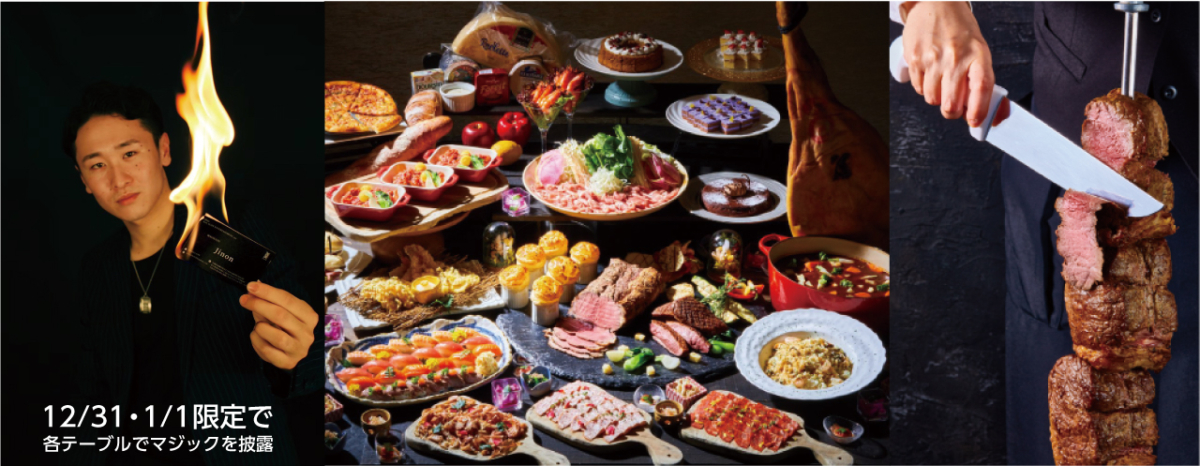 専用のグリルマシンで焼き上げた3種のシュラスコをお客様の目の前で豪快にカットしお好きなだけサーブします。その他豪華メニューをご用意。2025年の締めくくりと、2026年の幕開けにふさわしいお料理の数々をお愉しみください。