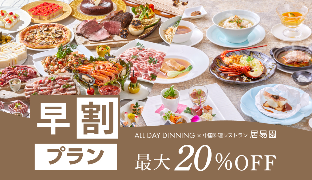 大切な日のお食事や、ご友人・ご家族との会食を計画的に予約するのが断然お得に!当ホテルの人気レストランでは、ご予約いただく時期に応じて割引率がアップする「早割プラン」が販売スタート。対象となるのは4F ALL DAY DININGのランチビュッフェ、3F 中国料理レストラン居易園の本格コース料理をランチとディナーでご提供します。最大20%OFFで、上質な料理を心ゆくまでお楽しみいただけます。
