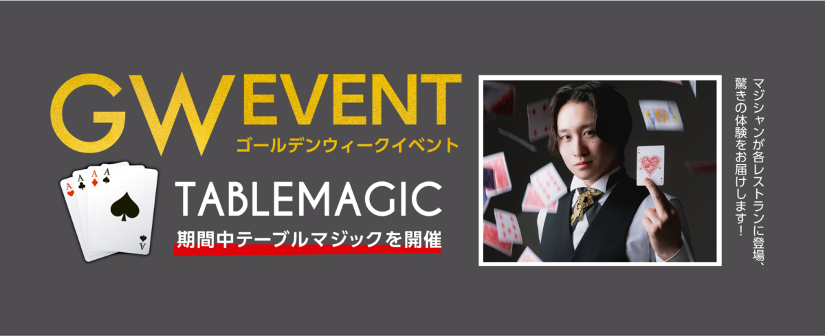 心弾むゴールデンウィークの夜に、驚きと笑顔がこぼれるひととき。5月2日から5日までの4日間、各レストランおよびBARにて、マジシャンによるテーブルマジックを開催。お客様の目の前で繰り広げられる息をのむような鮮やかなパフォーマンス。シェフ自慢の美味しいお食事や、グラスを傾けるくつろぎの時間に非日常のスパイスをお届けいたします。