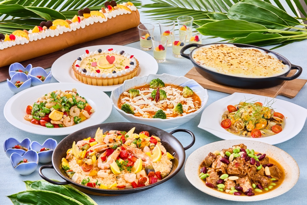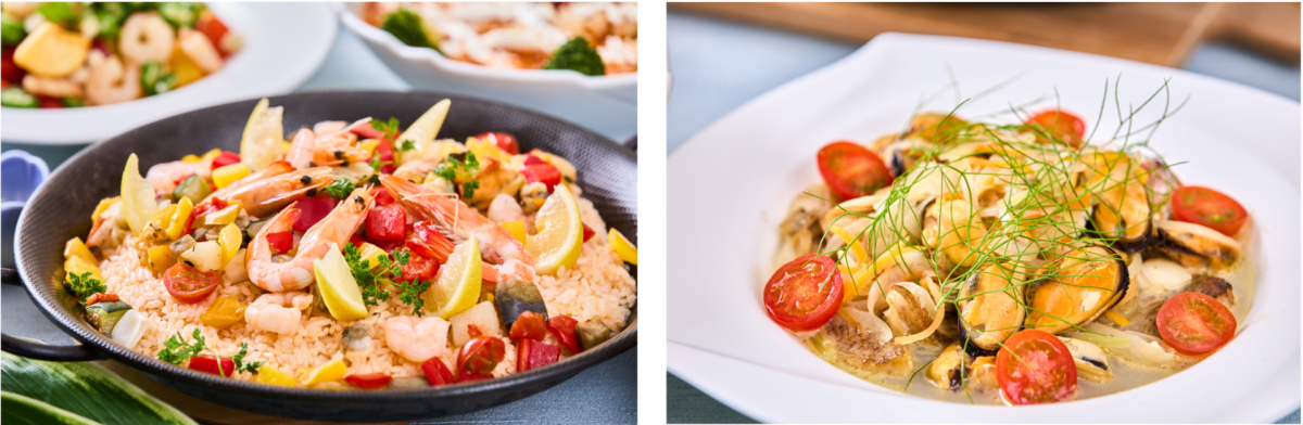 4F Vision&Emotionでは地中海フェアを開催、フォルメンテーラ島のサラダ(スペイン)や、豚肉と玉ねぎのナポリ風 ジェノベーゼ(イタリア)、ハーブ香るエビとイカのサガナキ(ギリシャ)や魚介類のアクアパッツァ(イタリア)などのフェアメニューの他、人気の寿司、天ぷら、しゃぶしゃぶ、ローストビーフはもちろん平日限定でうなぎが登場します。