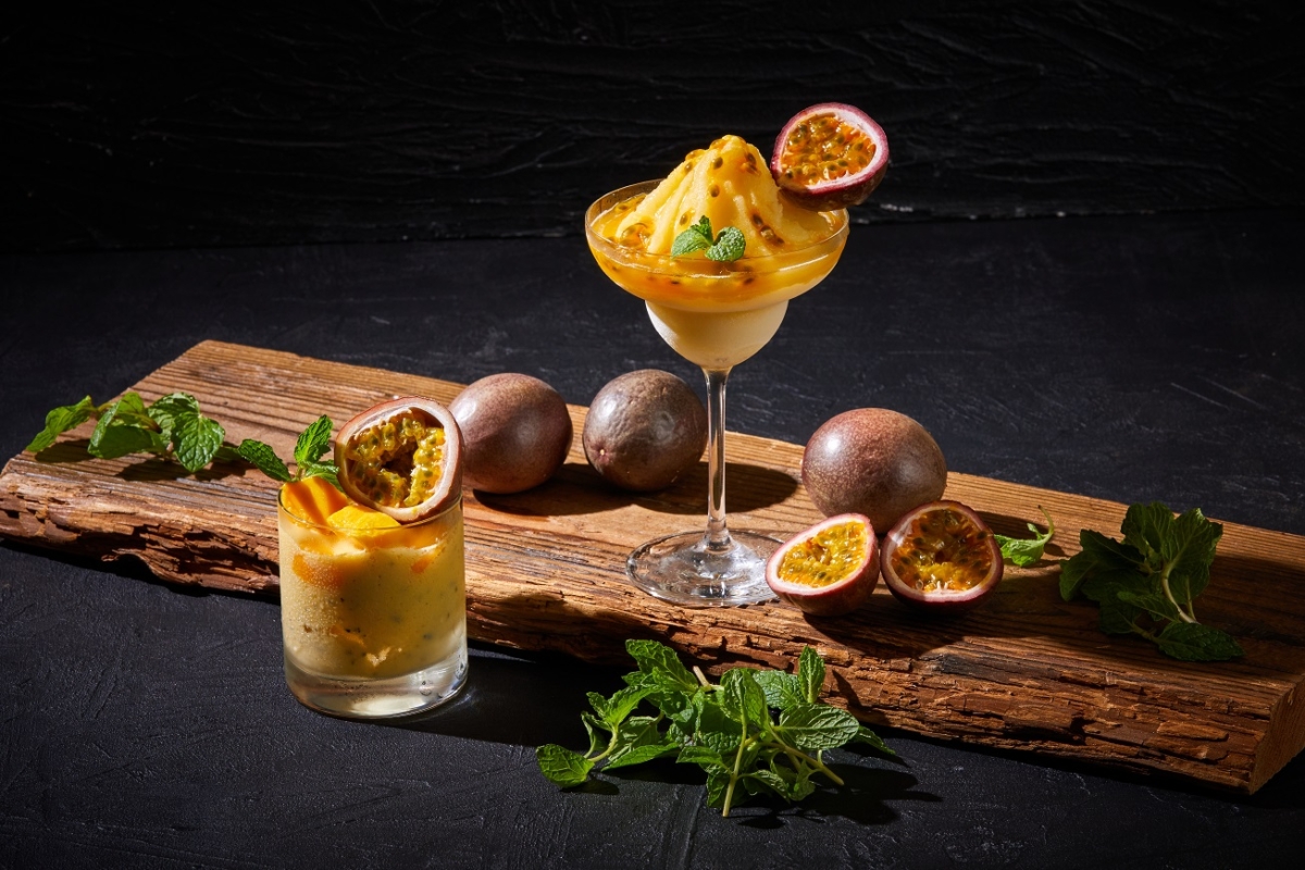 「弾ける熱帯の香り」フレッシュパッションフルーツを丸ごと1個贅沢に使いパイナップルと一緒に鮮烈な香りをフローズンに閉じ込めました。種のカリカリ感とくちどけがたまらない究極のデザートカクテルです。