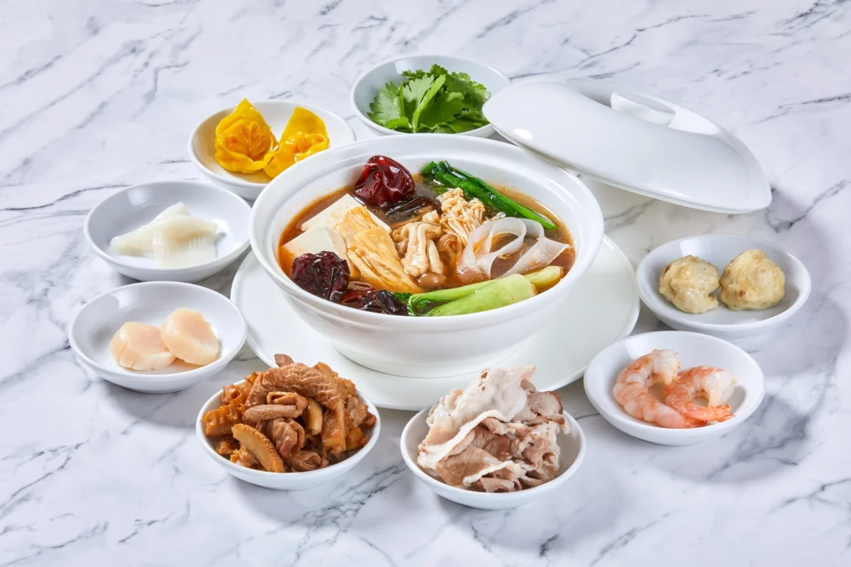 世界三大ハムの一つ 金華ハム(熟成させた豚もも肉の生ハム)を使用し、長時間かけ丁寧に作り出したスープに山椒(麻)と唐辛子(辣)などのスパイスを効かせたヘルシーで痺れる辛さ。美容と健康に良い薬膳スープに、お好みで手作りのイカ団子や海老雲吞などの具材を追加し