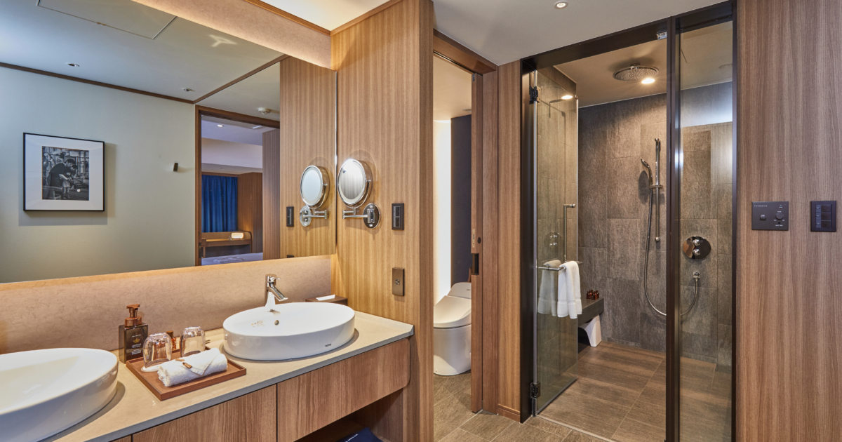以藍色為基調的67平方公尺客房,設有寬敞沙發與65吋電視的客廳。5至12樓客房皆為轉角房型,您可於鋪設琉球榻榻米的和風空間中盡情放鬆。入住期間可享用13樓行政酒廊服務。
