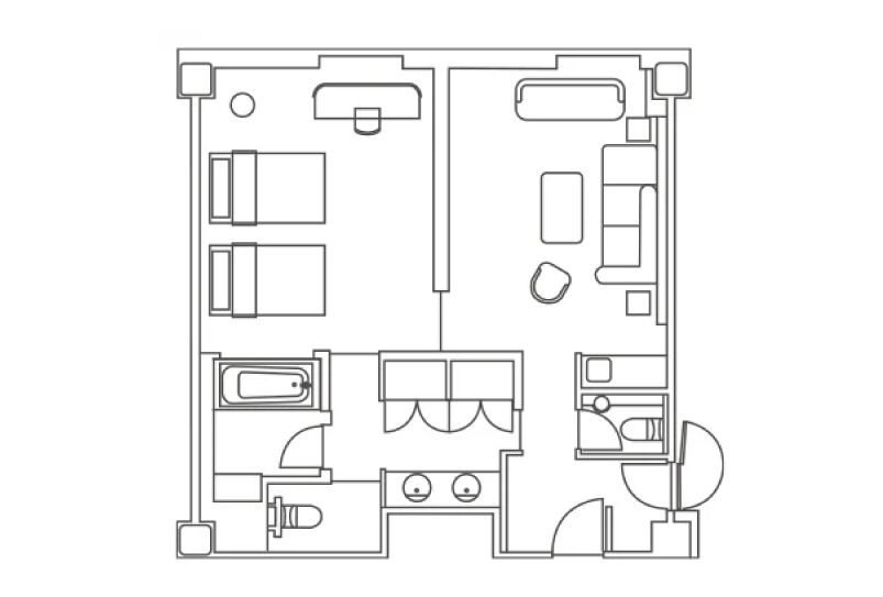以藍色為基調的62平方公尺客房內,設有寬敞沙發與65吋電視的客廳。入住期間可享用位於13樓的行政酒廊。